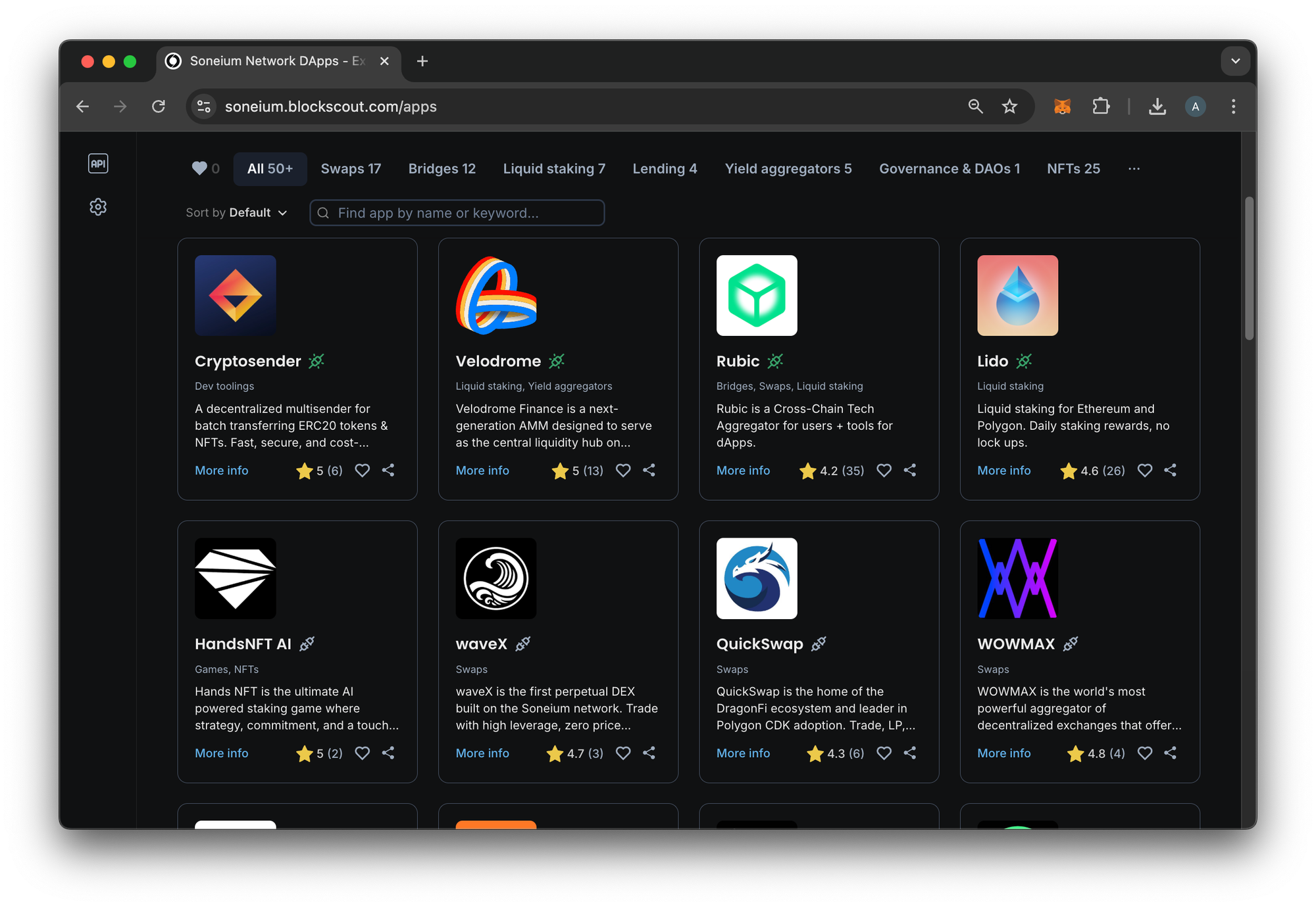 📀 Soneium continues to gain momentum in the blockchain ecosystem, attracting many new users and to their fast and rapidly expanding platform. We integrated Dappscout into the Soneium explorer to provide users with a curated dapps list including swaps, bridges, liquid staking, lending and NFT protocols.