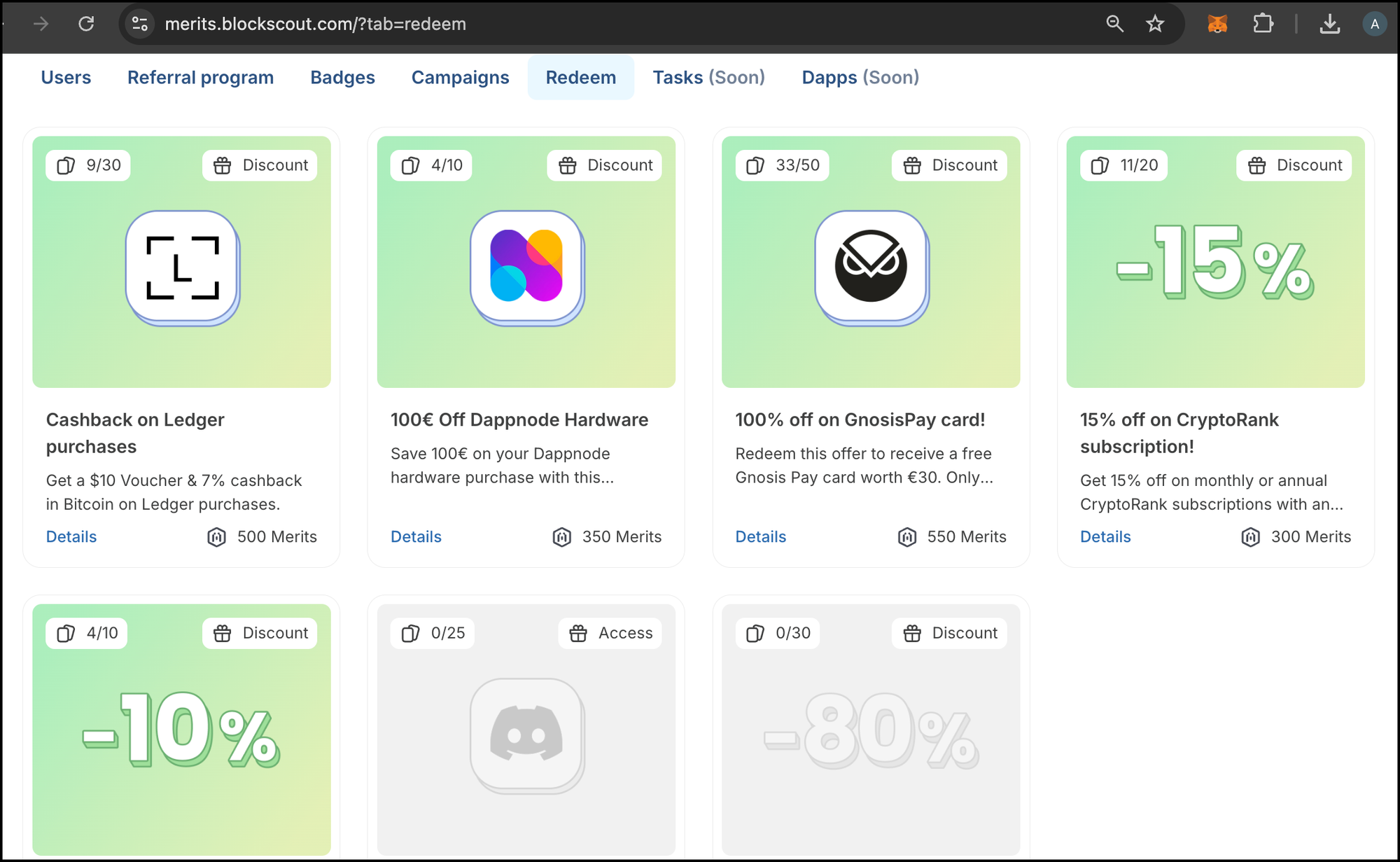 - Checkout the latest addition to the Merits program - our Merits Redemption Marketplace where you can trade Merits for services and discounts including offerings from Ledger, Dappnode, GnosisPay, Cryptorank, Bankless, XName and more! Use your Merits to access exclusive discounts on useful web3 products.