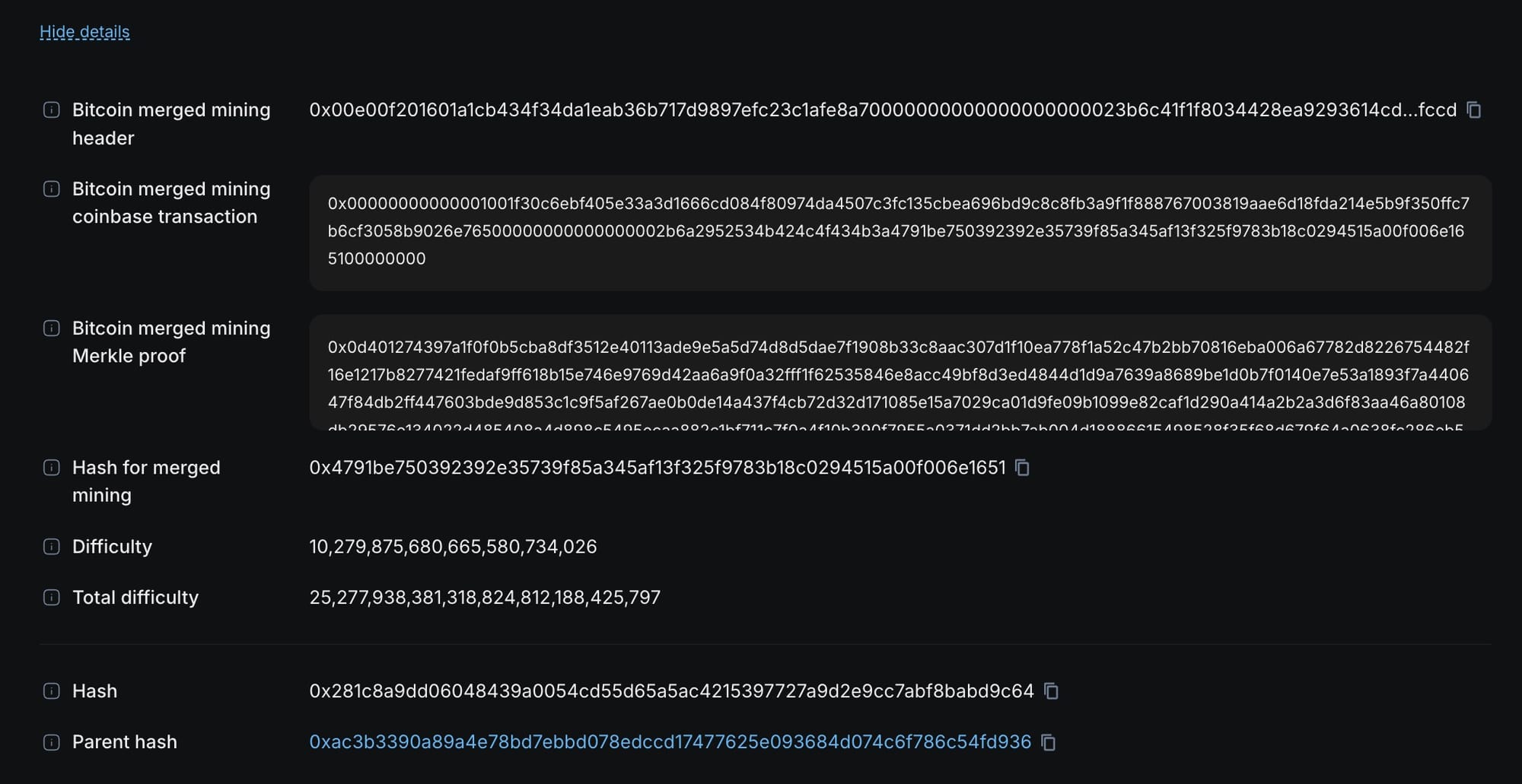 We also added additional data fields related to RSK-Bitcoin merged mining. This feature allows Bitcoin miners to mine RSK simultaneously with no additional cost or impact. Information includes the Bitcoin merged mining header, merged mining coinbase transaction (which includes RSKblockinfo), merged mining Merkle proof, merged mining hash, and block difficulty.