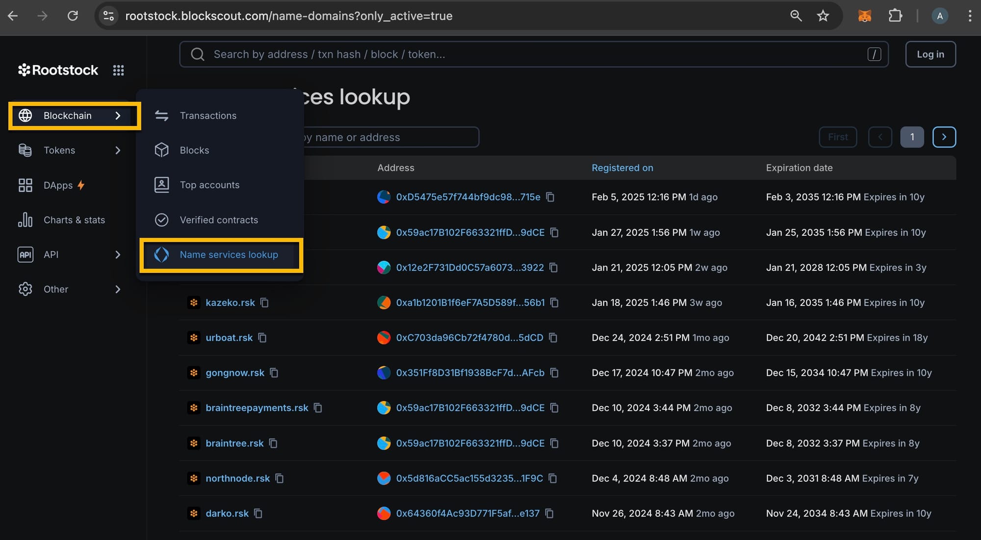 Users can now search for .rsk names on the Blockscout Rootstock explorer and use the name services lookup feature to find and filter info related to .rsk addresses.