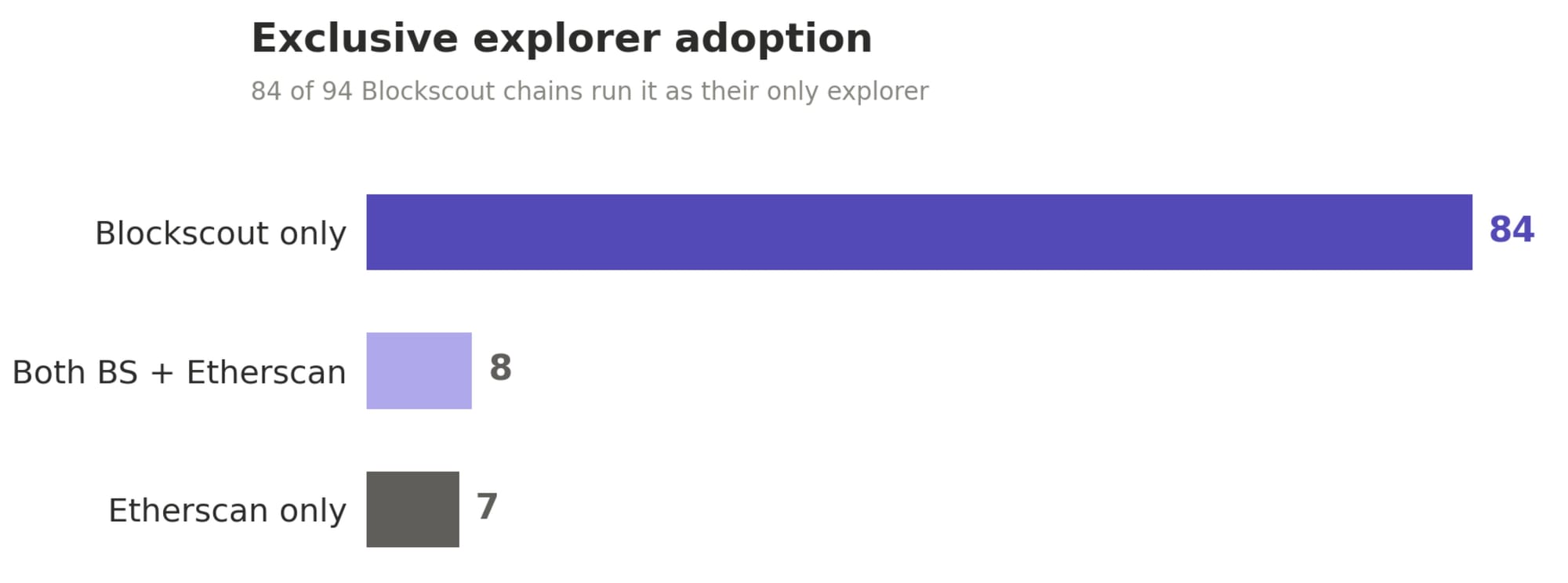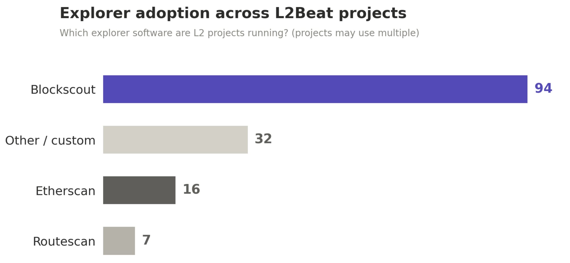 67% of L2 projects with a live explorer run Blockscout. That's 94 chains. Etherscan covers 16. Routescan covers 7.