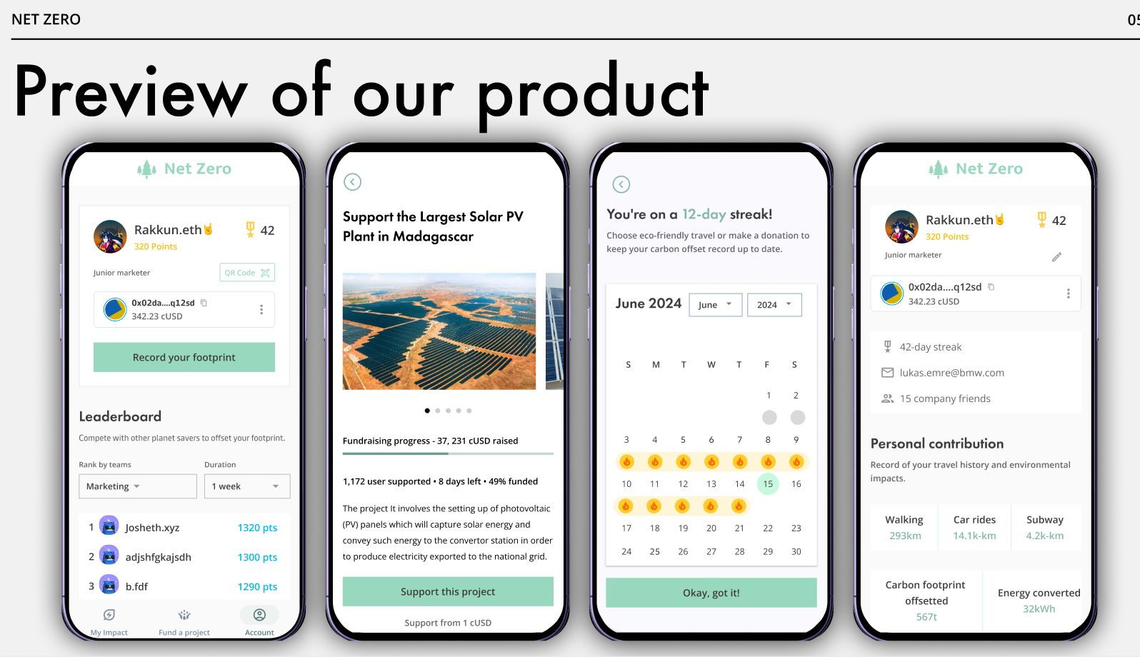 Net Zero took on the challenge of measuring and offsetting carbon emissions using blockchain technology. This project aimed to address the difficulties companies face in measuring and offsetting their carbon footprint, as well as the funding and awareness challenges faced by climate projects.