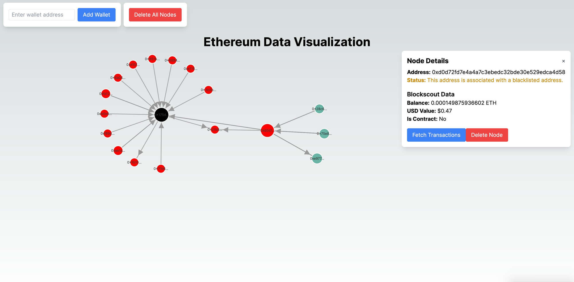 Using D3.js, ETHFlow creates dynamic, interactive graphs where each node represents a wallet address and edges between nodes represent transactions. This visualization helps users see how different wallets are connected and how funds move between them, making complex blockchain data more intuitive to understand.