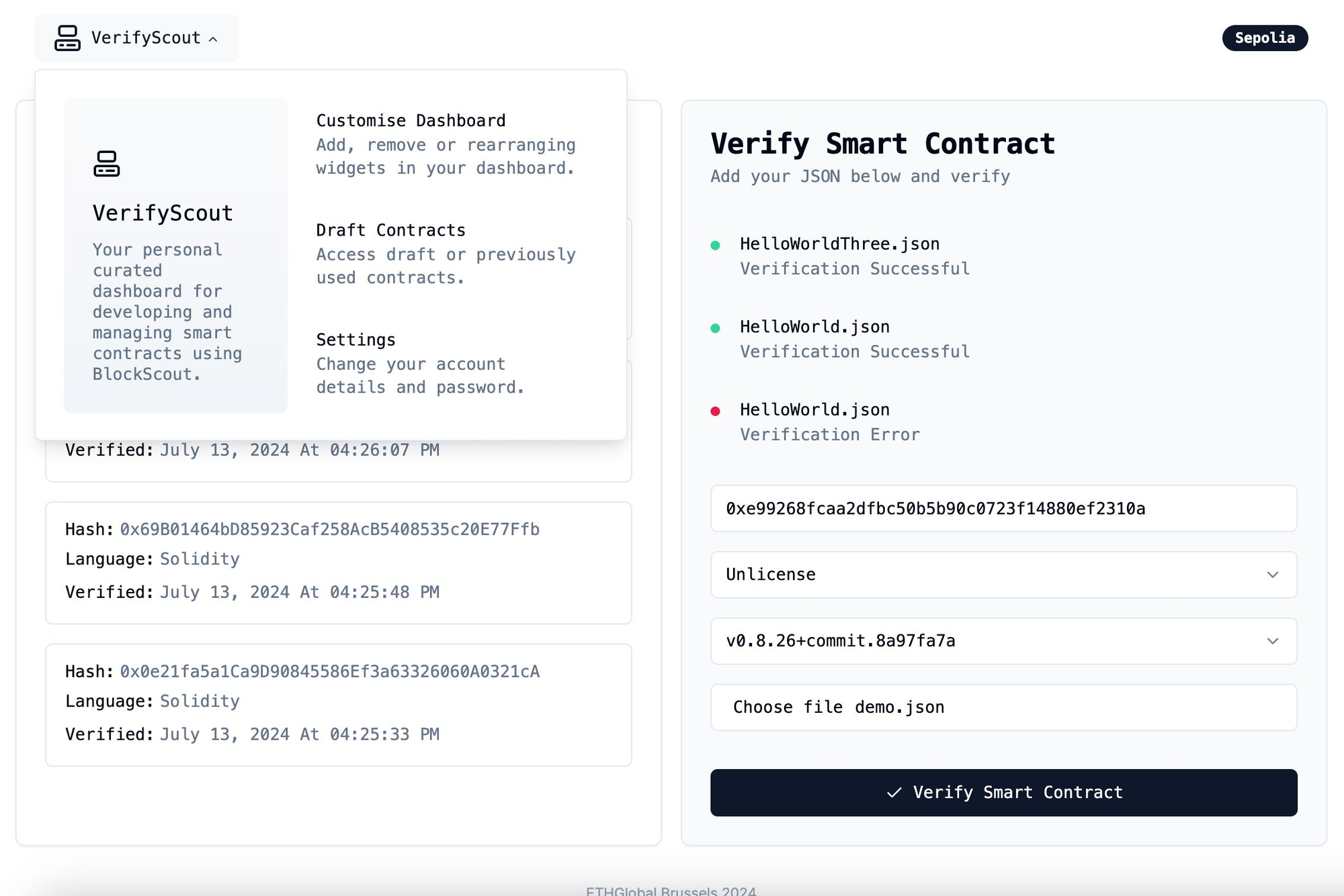 VerifyScout created a curated dashboard for developing and managing smart contracts using Blockscout. This innovative tool allows users to view and verify contracts on Blockscout, streamlining the process of contract management.