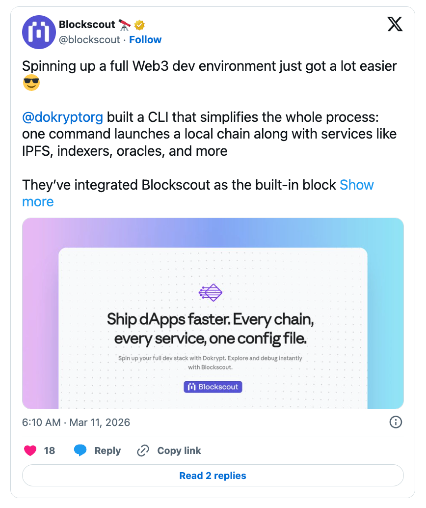 - Dokrypt integrates Blockscout into their full-stack web3 setup tool