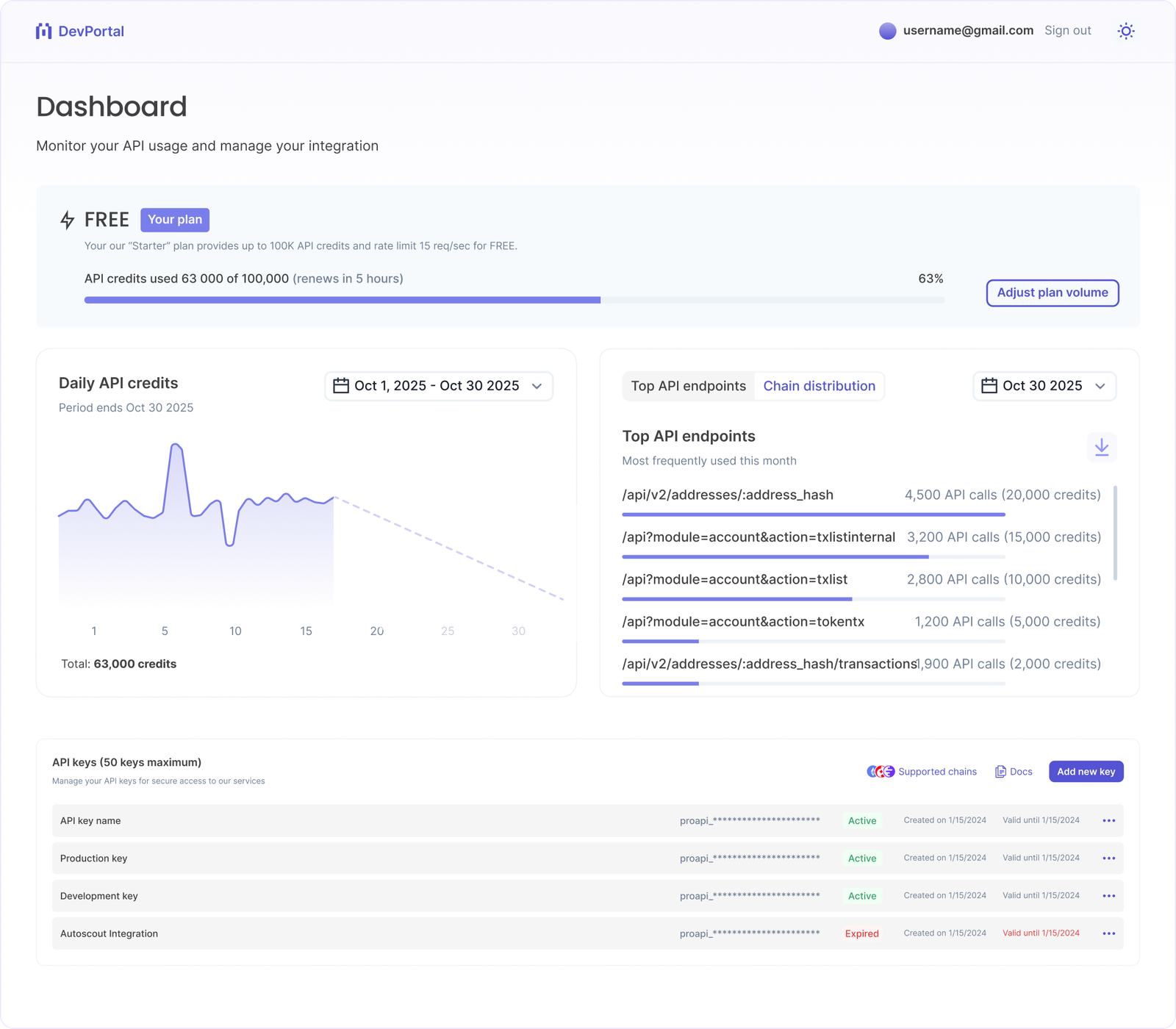 Your developer portal gives you real-time usage stats and up to 50 unique API keys with on-demand regeneration. Business and enterprise tiers are also available for power users.