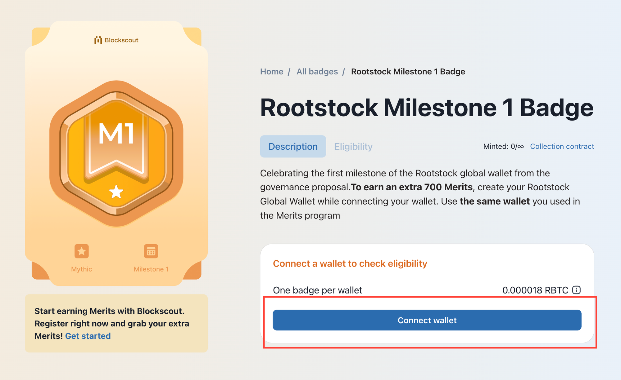 If you mint using the Rootstock Global Wallet, for each milestone badge you will receive a 700 Merits bonus 🎁