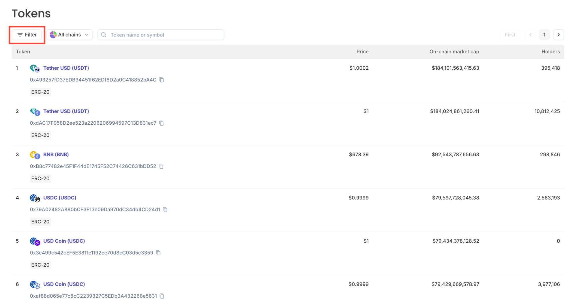 The Tokens page allows you to explore token data across networks. Filter tokens by chain or view token activity across all supported networks. Token types can also be filtered, including:
