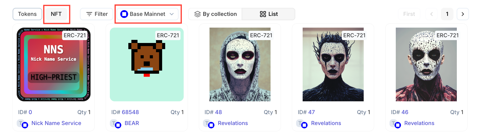 NFTs can be filtered by chain and token standard, and grouped by collection or a plain list. This makes it easy to explore how NFT assets are distributed across ecosystems and collections.