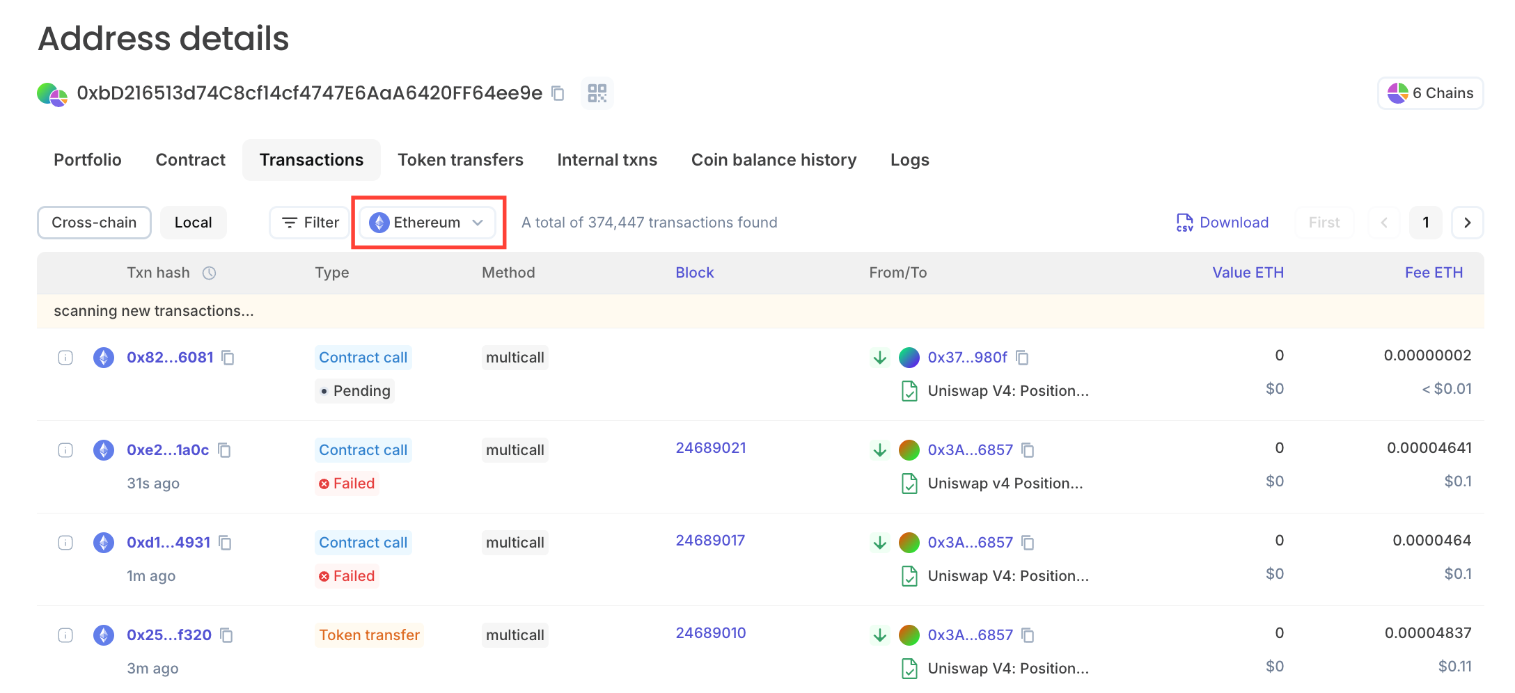 One of the most powerful features of the multichain explorer is the cross-chain wallet view. When viewing an externally owned account (EOA), you can see a full portfolio breakdown across chains.
