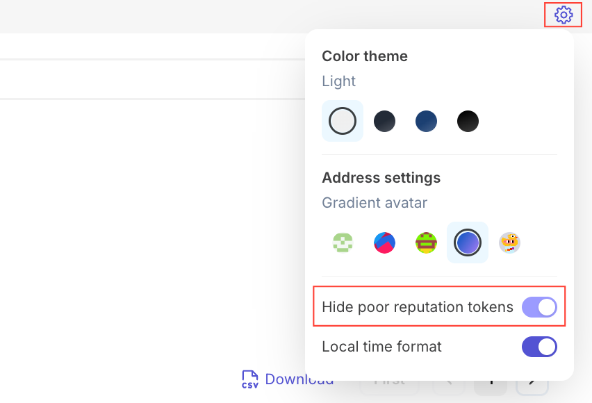From the gear icon at the top right, you can filter out tokens with a poor reputation for a cleaner view and more meaningful data across all sections in the multichain explorer.