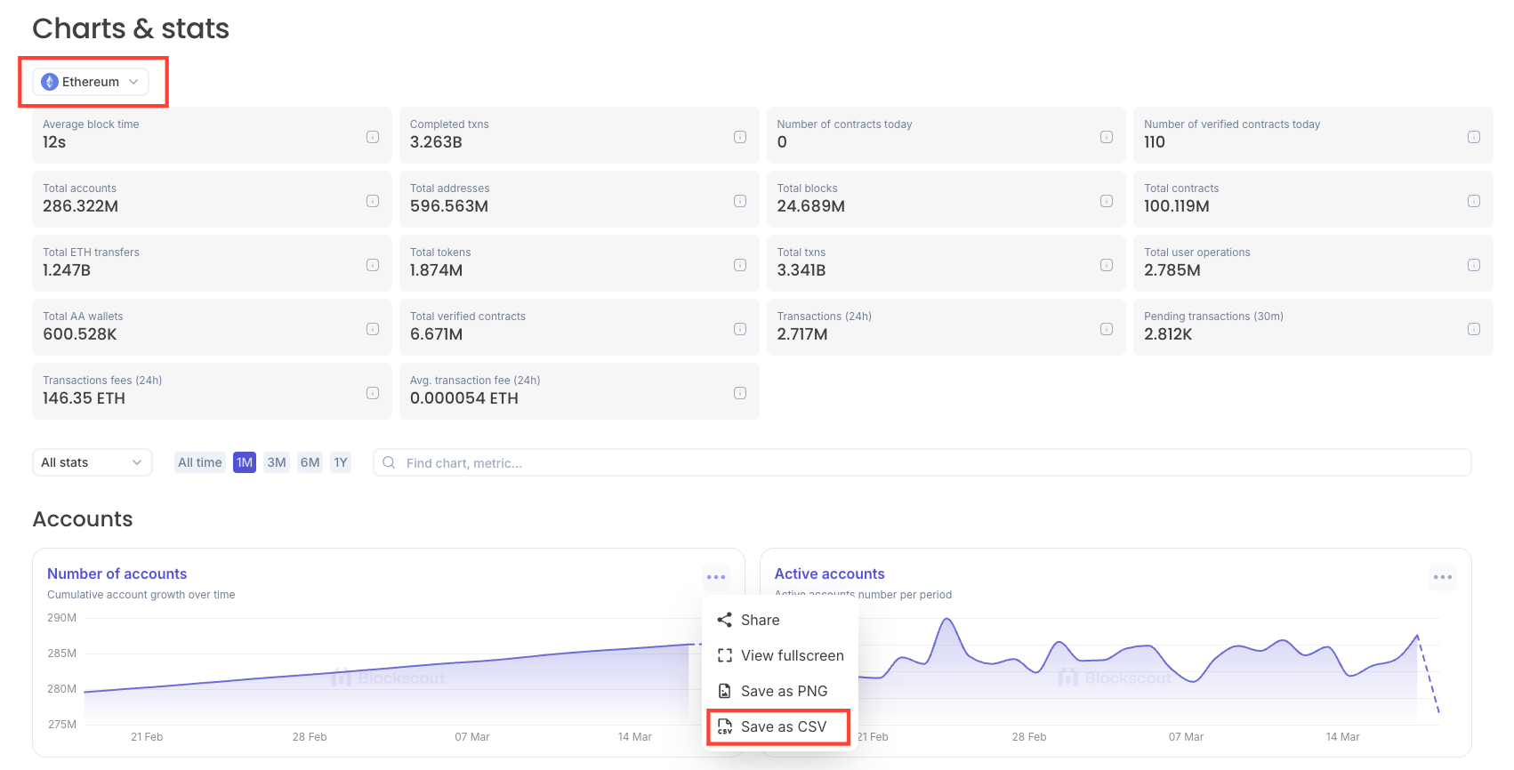 Each chart provides a clear view of how activity evolves over time, making it easier to spot trends, spikes, and shifts in usage. For deeper analysis, chart data can be downloaded as PNG or CSV, allowing users to export and work with the raw data externally.