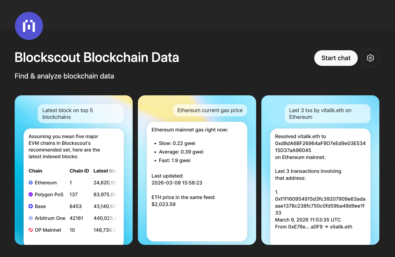 The ChatGPT app is our newest addition, and Blockscout is the first and only app currently approved on ChatGPT for blockchain data. It gives users multichain access to explore and analyze data without leaving the chat.