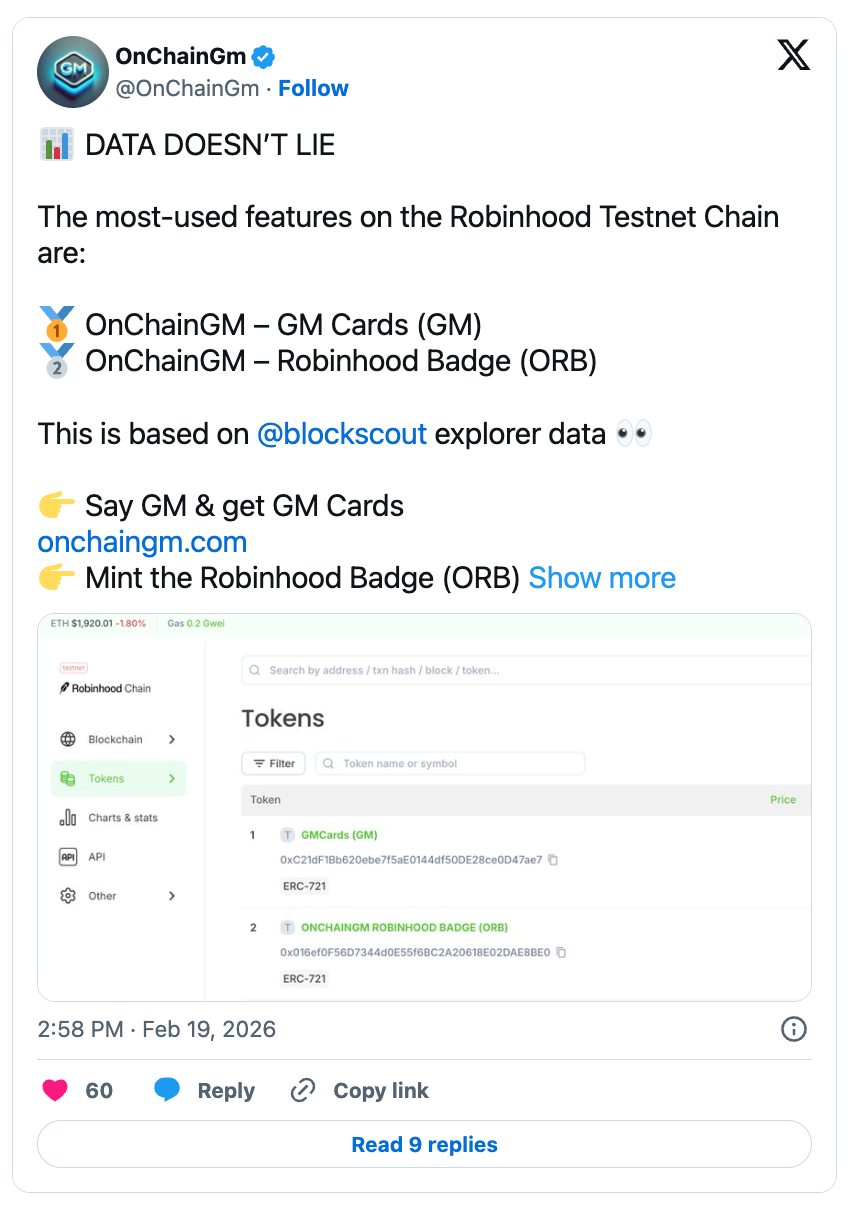 For now, interested parties are exploring the Robinhood chain testnet with Blockscout. There are already over 1.5M addresses and 10M total txs on the testnet. Since trading is not active, services like OnChainGM are gaining traction as users check out the chain.