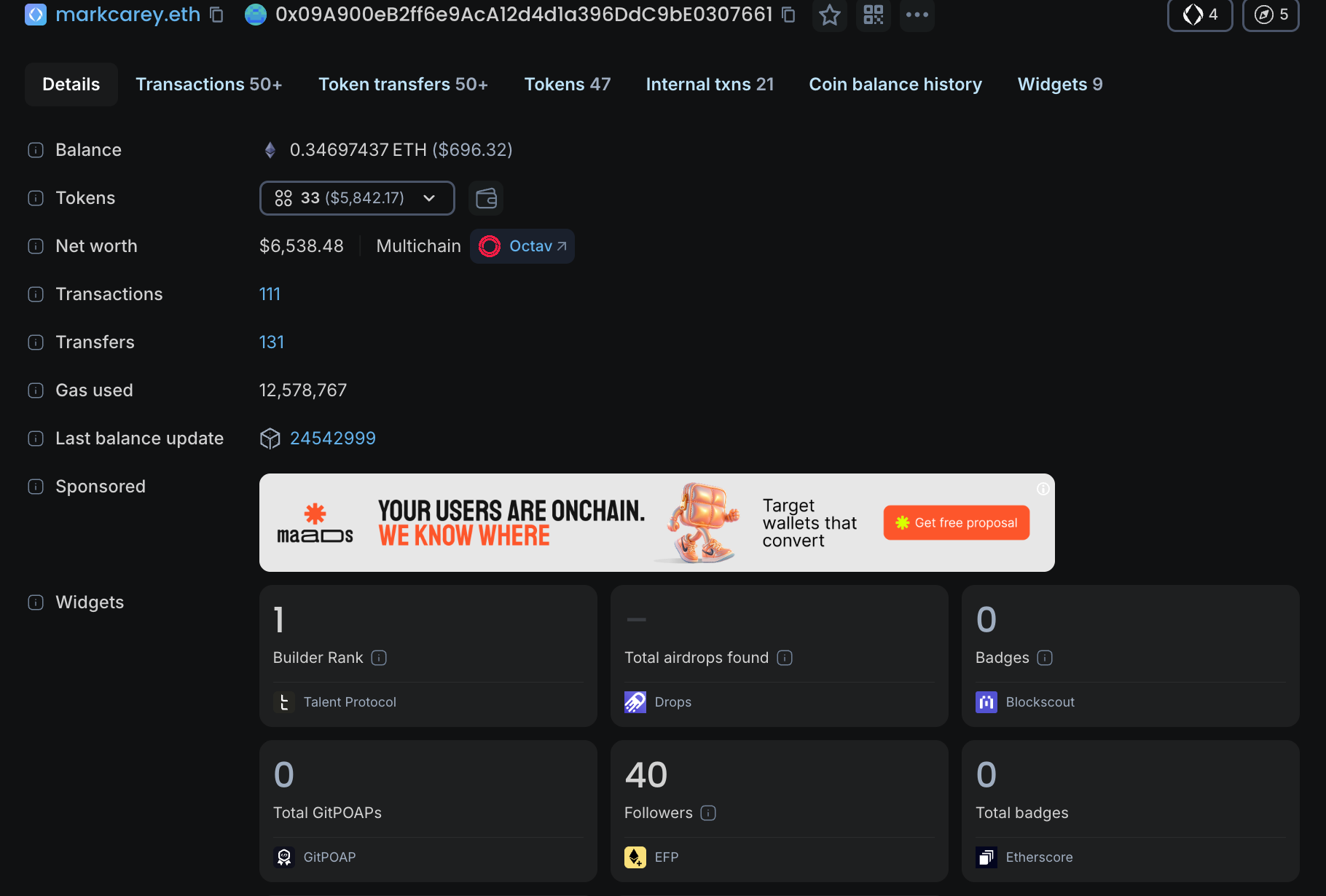 Look up any EOA or ENS name on Blockscout and scroll to the widgets section to see if the address is a recognized ecosystem builder, and where they rank with other builders.