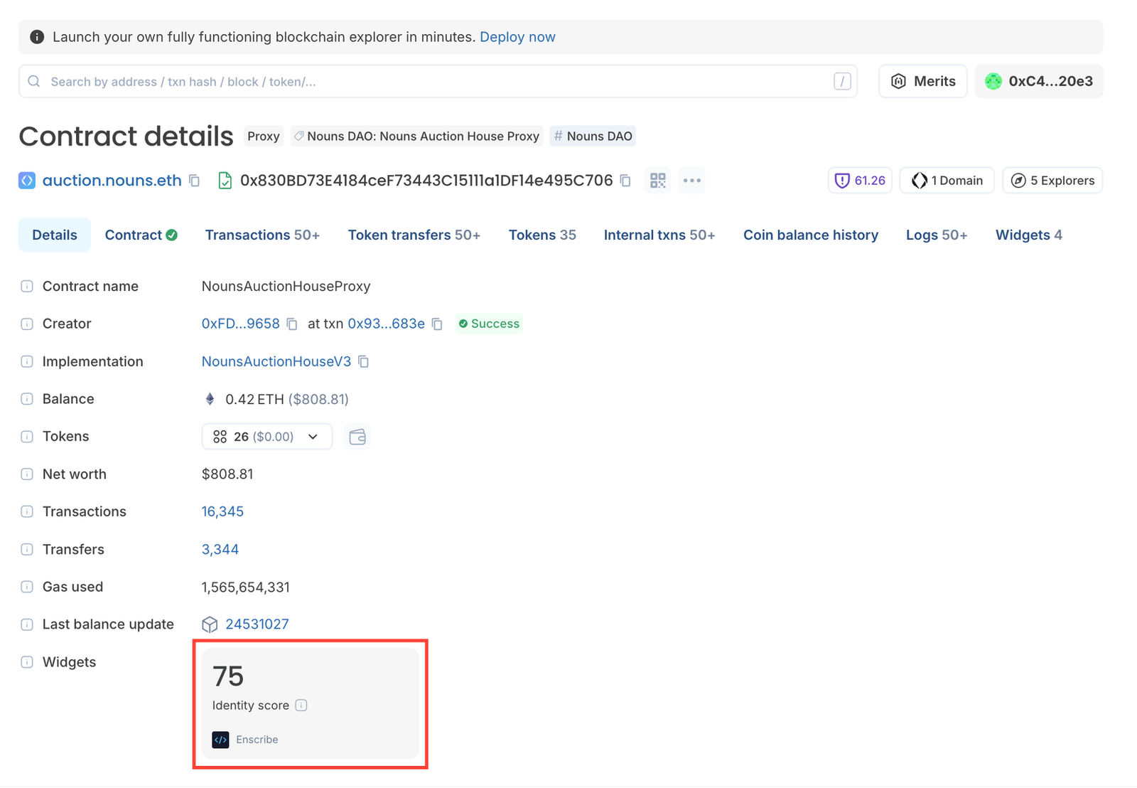 With the Enscribe identity widget, contracts are assigned an identity score (from 0 to 100). A high score means the contract has a properly configured primary ENS name with completed metadata.